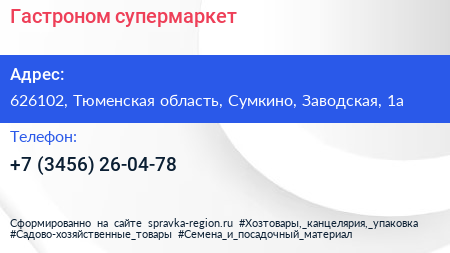 Гастроном, супермаркет по адресу 626102, Тюменская область, Сумкино, Заводская, 1а в дальнейшем Организация, размещена в следующих категориях: