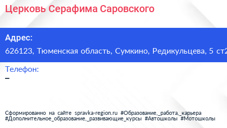 Церковь Серафима Саровского по адресу 626123, Тюменская область, Сумкино, Редикульцева, 5 ст2 в дальнейшем Организация, размещена в следующих категориях: