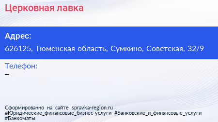 Церковная лавка по адресу 626125, Тюменская область, Сумкино, Советская, 32/9 в дальнейшем Организация, размещена в следующих категориях: