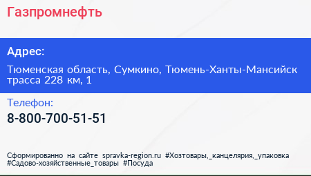 Газпромнефть по адресу Тюменская область, Сумкино, Тюмень-Ханты-Мансийск трасса 228 км, 1 в дальнейшем Организация, размещена в следующих категориях: