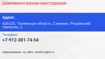 Шиномонтажная мастерская по адресу 626125, Тюменская область, Сумкино, Рощинский переулок, 1 в дальнейшем Организация, размещена в следующих категориях: