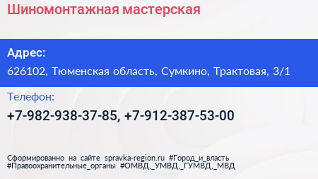 Шиномонтажная мастерская по адресу 626102, Тюменская область, Сумкино, Трактовая, 3/1 в дальнейшем Организация, размещена в следующих категориях: