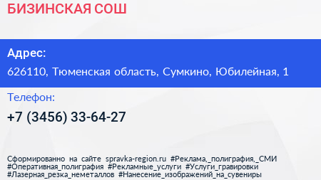 БИЗИНСКАЯ СОШ по адресу 626110, Тюменская область, Сумкино, Юбилейная, 1 в дальнейшем Организация, размещена в следующих категориях: