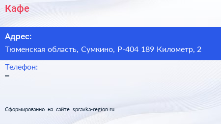 Кафе по адресу Тюменская область, Сумкино, Р-404 189 Километр, 2 в дальнейшем Организация, размещена в следующих категориях: