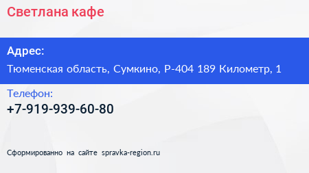 Светлана, кафе по адресу Тюменская область, Сумкино, Р-404 189 Километр, 1 в дальнейшем Организация, размещена в следующих категориях: