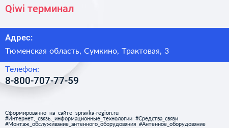 Qiwi, терминал по адресу Тюменская область, Сумкино, Трактовая, 3 в дальнейшем Организация, размещена в следующих категориях: