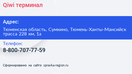 Qiwi, терминал по адресу Тюменская область, Сумкино, Тюмень-Ханты-Мансийск трасса 228 км, 1а в дальнейшем Организация, размещена в следующих категориях: