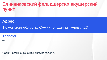 Блинниковский фельдшерско-акушерский пункт по адресу Тюменская область, Сумкино, Дачная улица, 23 в дальнейшем Организация, размещена в следующих категориях: