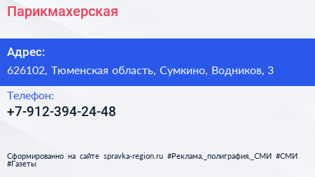 Парикмахерская по адресу 626102, Тюменская область, Сумкино, Водников, 3 в дальнейшем Организация, размещена в следующих категориях:
