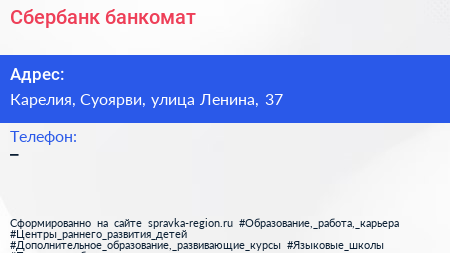 Сбербанк, банкомат по адресу Карелия, Суоярви, улица Ленина, 37 в дальнейшем Организация, размещена в следующих категориях: