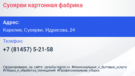 Суоярви, картонная фабрика по адресу Карелия, Суоярви, Идрисова, 24 в дальнейшем Организация, размещена в следующих категориях: