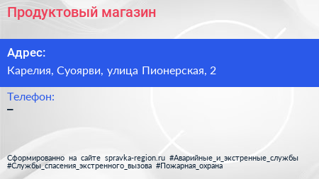 Продуктовый магазин по адресу Карелия, Суоярви, улица Пионерская, 2 в дальнейшем Организация, размещена в следующих категориях: