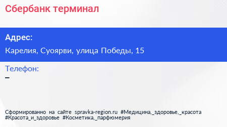 Сбербанк, терминал по адресу Карелия, Суоярви, улица Победы, 15 в дальнейшем Организация, размещена в следующих категориях: