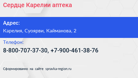 Сердце Карелии, аптека по адресу Карелия, Суоярви, Кайманова, 2 в дальнейшем Организация, размещена в следующих категориях: