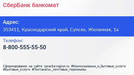 СберБанк, банкомат по адресу 353411, Краснодарский край, Супсех, Желанная, 1а в дальнейшем Организация, размещена в следующих категориях: