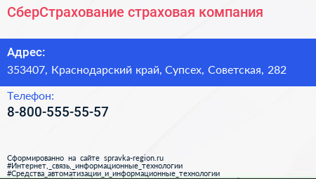 СберСтрахование, страховая компания по адресу 353407, Краснодарский край, Супсех, Советская, 282 в дальнейшем Организация, размещена в следующих категориях: