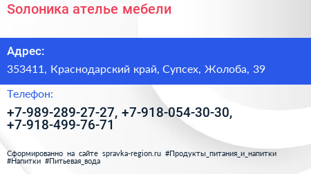 Sолоника, ателье мебели по адресу 353411, Краснодарский край, Супсех, Жолоба, 39 в дальнейшем Организация, размещена в следующих категориях: