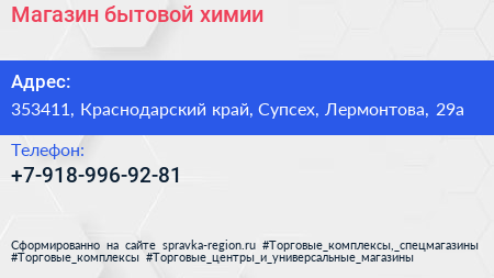 Магазин бытовой химии по адресу 353411, Краснодарский край, Супсех, Лермонтова, 29а в дальнейшем Организация, размещена в следующих категориях: