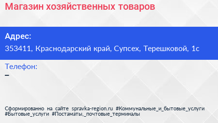 Магазин хозяйственных товаров по адресу 353411, Краснодарский край, Супсех, Терешковой, 1с в дальнейшем Организация, размещена в следующих категориях: