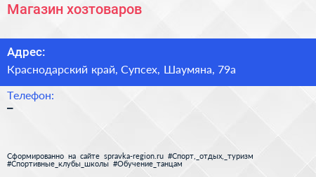 Магазин хозтоваров по адресу Краснодарский край, Супсех, Шаумяна, 79а в дальнейшем Организация, размещена в следующих категориях: