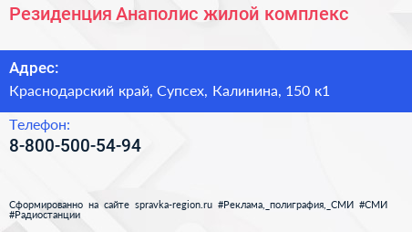 Резиденция Анаполис, жилой комплекс по адресу Краснодарский край, Супсех, Калинина, 150 к1 в дальнейшем Организация, размещена в следующих категориях: