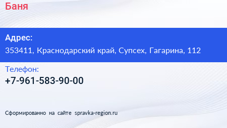 Баня по адресу 353411, Краснодарский край, Супсех, Гагарина, 112 в дальнейшем Организация, размещена в следующих категориях: