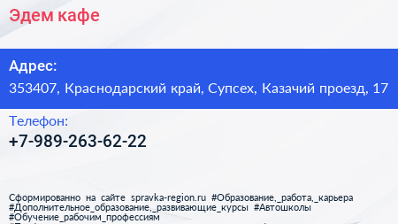 Эдем, кафе по адресу 353407, Краснодарский край, Супсех, Казачий проезд, 17 в дальнейшем Организация, размещена в следующих категориях: