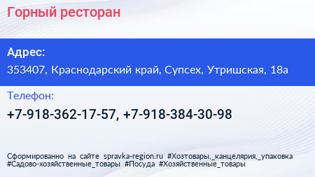 Горный, ресторан по адресу 353407, Краснодарский край, Супсех, Утришская, 18а в дальнейшем Организация, размещена в следующих категориях: