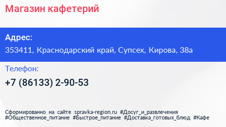 Магазин-кафетерий по адресу 353411, Краснодарский край, Супсех, Кирова, 38а в дальнейшем Организация, размещена в следующих категориях: