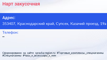 Нарт, закусочная по адресу 353407, Краснодарский край, Супсех, Казачий проезд, 19а в дальнейшем Организация, размещена в следующих категориях: