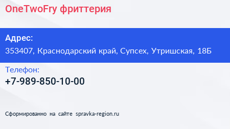 OneTwoFry, фриттерия по адресу 353407, Краснодарский край, Супсех, Утришская, 18Б в дальнейшем Организация, размещена в следующих категориях: