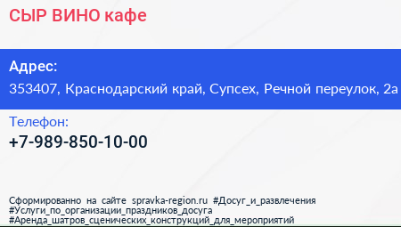 СЫР ВИНО, кафе по адресу 353407, Краснодарский край, Супсех, Речной переулок, 2а в дальнейшем Организация, размещена в следующих категориях:
