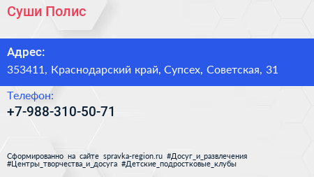 Суши Полис по адресу 353411, Краснодарский край, Супсех, Советская, 31 в дальнейшем Организация, размещена в следующих категориях: