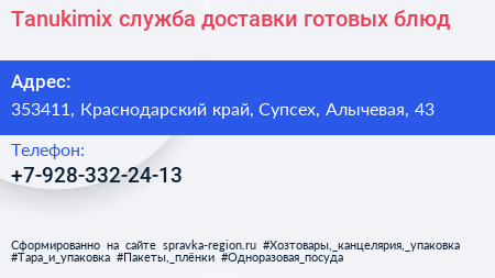 Tanukimix, служба доставки готовых блюд по адресу 353411, Краснодарский край, Супсех, Алычевая, 43 в дальнейшем Организация, размещена в следующих категориях: