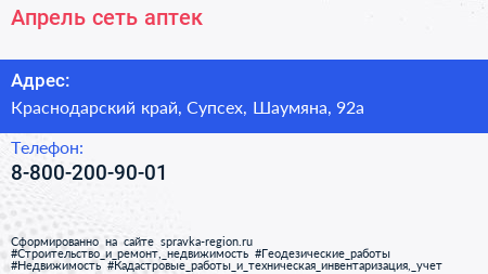 Апрель, сеть аптек по адресу Краснодарский край, Супсех, Шаумяна, 92а в дальнейшем Организация, размещена в следующих категориях: