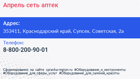 Апрель, сеть аптек по адресу 353411, Краснодарский край, Супсех, Советская, 2а в дальнейшем Организация, размещена в следующих категориях: