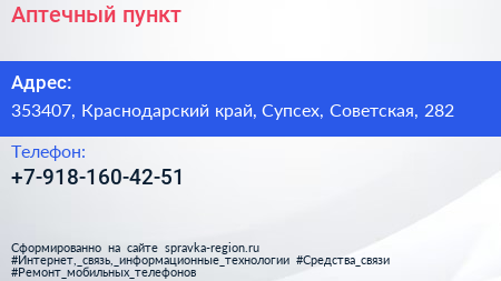 Аптечный пункт по адресу 353407, Краснодарский край, Супсех, Советская, 282 в дальнейшем Организация, размещена в следующих категориях: