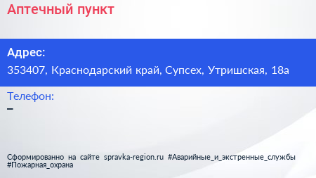 Аптечный пункт по адресу 353407, Краснодарский край, Супсех, Утришская, 18а в дальнейшем Организация, размещена в следующих категориях: