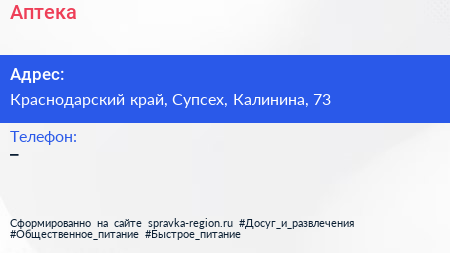 Аптека по адресу Краснодарский край, Супсех, Калинина, 73 в дальнейшем Организация, размещена в следующих категориях: