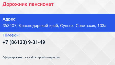 Дорожник, пансионат по адресу 353407, Краснодарский край, Супсех, Советская, 103а в дальнейшем Организация, размещена в следующих категориях: