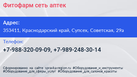 Фитофарм, сеть аптек по адресу 353411, Краснодарский край, Супсех, Советская, 29а в дальнейшем Организация, размещена в следующих категориях: