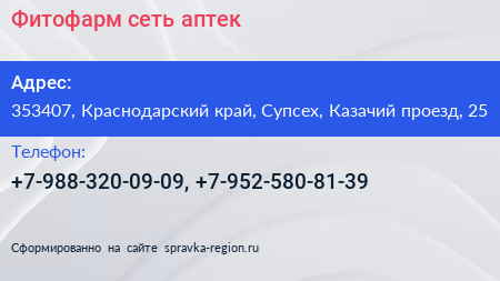 Фитофарм, сеть аптек по адресу 353407, Краснодарский край, Супсех, Казачий проезд, 25 в дальнейшем Организация, размещена в следующих категориях: