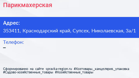 Парикмахерская по адресу 353411, Краснодарский край, Супсех, Николаевская, 3а/1 в дальнейшем Организация, размещена в следующих категориях: