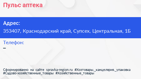 Пульс, аптека по адресу 353407, Краснодарский край, Супсех, Центральная, 1Б в дальнейшем Организация, размещена в следующих категориях: