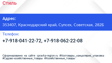 Стиль по адресу 353407, Краснодарский край, Супсех, Советская, 282Б в дальнейшем Организация, размещена в следующих категориях: