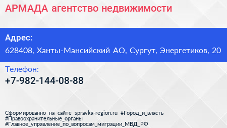 АРМАДА, агентство недвижимости по адресу 628408, Ханты-Мансийский АО, Сургут, Энергетиков, 20 в дальнейшем Организация, размещена в следующих категориях: