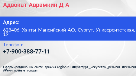 Адвокат Аврамкин Д.А. по адресу 628406, Ханты-Мансийский АО, Сургут, Университетская, 19 в дальнейшем Организация, размещена в следующих категориях: