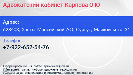 Адвокатский кабинет Карпова О.Ю. по адресу 628403, Ханты-Мансийский АО, Сургут, Маяковского, 31 в дальнейшем Организация, размещена в следующих категориях: