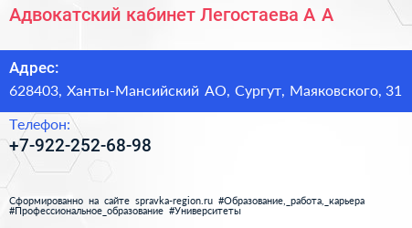 Адвокатский кабинет Легостаева А.А. по адресу 628403, Ханты-Мансийский АО, Сургут, Маяковского, 31 в дальнейшем Организация, размещена в следующих категориях: