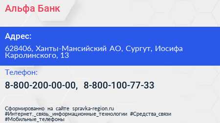 Альфа-Банк по адресу 628406, Ханты-Мансийский АО, Сургут, Иосифа Каролинского, 13 в дальнейшем Организация, размещена в следующих категориях: